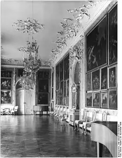 - ↑ Eine vergleichbare lückenlose Hängung besteht in der Bildergalerie (Sanssouci), doch sind die Werke dort nicht geschnitten und in Wandfelder eingelassen, auch gemindert durch Kriegsverluste.