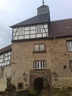 Im Winkel von Nord- und Nordostflügel befindet sich auf der Hofseite ein viergeschossiger polygonaler Treppenturm mit Bruchsteinmauerwerk, Eckquaderungen und Sockelgesims, der mit drei Seiten eines Achtecks herauskragt und über seinen drei Obergeschossen durch umlaufendes Gesims mit Karniesprofil verziert ist. An der Südseite ist der Eingang mit der Jahreszahl 1600 zwischen zwei Puttenköpfen über dem gotisierenden Schulterbogenportal. Über dem Portal verläuft ein karniesprofiliertes Gesims mit Zahnschnitt; darauf befindet sich zwischen Hermenpilaster und Dreiecksgiebel und mit Voluten gerahmt ein Doppelwappen der von Baumbach und der Schutzbar genannt Milchling.[5] Der Treppenturm und die beiden anschließenden Flügel gehören einem gemeinsamen Baukonzept an, und aus der Höhe des Treppenturms als Steinbau schließt man, dass auch die beiden Gebäudeflügel ursprünglich Obergeschosse aus Stein oder deutlich repräsentativerem Fachwerk gehabt haben dürften.