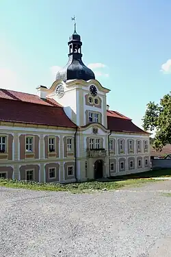 Das Schloss ist ein Beispiel der stilreinen, auf Wien orientierten Barockarchitektur in Böhmen. Von 1706 an wurde es nach Plänen von Johann Lucas von Hildebrandt durch den Pilsner Baumeister Jakob Auguston für Adam Heinrich von Steinau erbaut. Das Schloss wird durch zwei einander gegenüberliegende Gebäude gebildet, die früher an den Seiten durch Arkadengänge und Terrassen verbunden waren. Ende des 18. Jahrhunderts wurde das Schloss von Václav Haberditz und Johann Ignaz Palliardi rekonstruiert. Im Innern befinden sich Bilder des Prager Malers Antonín Tuvora.
