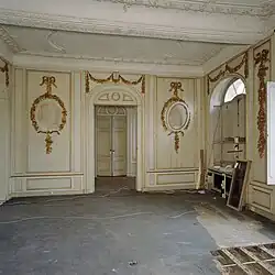 Im Inneren ist trotz langem Leerstand, fehlender Instandhaltung und allmählichem Verfall noch viel der historischen Innenausstattung des Schlosses erhalten. Das zentrale Treppenhaus besitzt noch seine breite Holztreppe mit schmiedeeisernem Geländer im Stil Louis-seize. Die Stuckdecke in diesem Raum stammt aus dem 19. Jahrhundert,[24] während andere Decken des Gebäudes noch Stuckdekorationen im Stil Louis-quinze aufweisen. Diese stammen möglicherweise vom Schlaunschen Umbau.[25] Der gleiche Kunststil ist an drei roten und einem schwarzen Marmorkamin zu finden. Ein Kamin aus rotem und weißem Marmor im Stil Louis-seize und drei kleinere Kamine im Régencestil und sind ebenfalls noch erhalten, genauso wie einige Supraporten aus dem 18. Jahrhundert, die Porträts, Landschaften und mythologische Szenen zeigen. Einer der insgesamt noch recht gut erhaltenen Räume ist der im Erdgeschoss befindliche Goldene Saal, ein Salon im Empirestil mit goldverzierter weißer Täfelung. Im südwestlichen Eckturm aus dem 17. Jahrhundert sind Reste einer hölzernen Wendeltreppe und zwei Türen aus der Erbauungszeit des Turms zu finden.