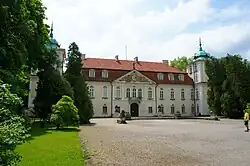 Der barocke Park wurde in der zweiten Hälfte des 18. Jahrhunderts durch Simon Gottlieb Zug im französischen Stil angelegt. An der Südseite des Schlosses befindet sich ein Blumenparterre und ein Buchsbaumlabyrinth. Den Park wird von einer breiten Lindenallee mit Rasenteppich durchzogen, die auf die Mitte des Schlosses zuführt. Die Hauptallee endet mit einem Ha-Ha. Westlich des Schlosses liegt ein Kanal mit winkelförmigem Grundriss. Er verbindet zwei Teiche und trennt den Barockgarten von einem sich anschließenden englischen Landschaftsgarten. Ab 1947 wurde der Schlossgarten durch Gerard Ciołek restauriert.