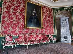 Der Rote Salon hat seine Ausstattung im Stil des Rokoko aus den sechziger Jahren des 18. Jahrhunderts bewahrt. Dominanter Akzent ist das Porträt von Gräfin Anna Karolina Orzelska, einer unehelichen Tochter des Königs August II. mit Henriette Renard, das vom preußischen Hofmaler Antoine Pesne geschaffen wurde.