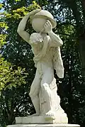 Duchênes Garten orientierte sich jedoch nicht am barocken Schlaun-Entwurf, sondern hatte eine vollkommen eigenständige Form. Aus dem schmalen Landstreifen nördlich des Schlossgebäudes wurde 1908/1909 eine Terrasse, von der eine neue 40 Meter lange Treppenanlage als Ersatz für die eiserne Weyhe-Brücke direkt zum neuen Gartenparterre führte.[55] Der Schlossteich nördlich der neuen Garteninsel erhielt als neue Begrenzungen an der Nord- und Südseite große Freitreppenanlagen mit plastischem Schmuck. Am Rand der nördlichen Marmortreppe sollten Skulpturen liegender Figuren aufgestellt werden, welche die vier Flüsse Rhein, Tiber, Nil und Euphrat darstellen sollten, jedoch sind nur der Rhein und der Tiber tatsächlich verwirklicht worden.[56] Die Figuren waren nur einige von sehr vielen, mit denen der Herzog von Arenberg den bis 1911[57] weitgehend fertiggestellten Inselbereich des Nordgartens ausstatten ließ. Teilweise handelte es sich dabei auch um Kopien älterer Statuen aus dem 18. Jahrhundert.