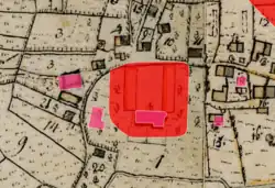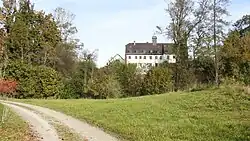 Schloss und Schlosskapelle, hoher Baukörper mit Schopfwalmdach und östlich vorspringender Apsis, erste Hälfte 18. Jahrhundert, mit älterem Kern.