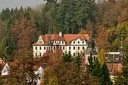 Ehemaliges Schloss, seit 1965 Schullandheim: Dreigeschossiger Bau über Hakengrundriss mit Walmdach und Zwerchhäusern, Pilastern, bandförmigen Gurtgesimsen und Hausteinrahmungen, Südflügel mit polygonalem Eckturm und Holzerker, Ostflügel mit Altan, über Kern des 16. Jahrhunderts, Neubau 1791–94, Umbau 1883, Umbau im Stile der Neorenaissance 1911