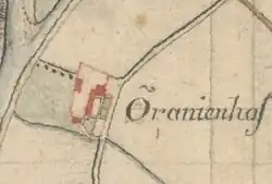 Spätestens in dieser Zeit war das Hofgebäude mit Scheune und Stallungen wiederhergestellt worden.[24] Die Geistliche Administration in Heidelberg bzw. die kurfürstliche Hofkammer der Kurpfalz erhob 1790 Besitzansprüche auf das ehemalige Kloster St. Peter,[25] die 1791/93 durch einen Austausch und Vergleich mit Sickingen unter Zustimmung von Kaiser Franz II. endgültig geregelt wurden.[26] Durch die französische Besetzung und Annexion des linken Rheinufers 1794/97 gelangte das Anwesen in Staatsbesitz und war um 1796 an Eberhard Hönes verpachtet, der 1801 dem Munizipalrat angehörte.[27][28] Reichsgraf Ludwig Kolb von Wartenberg-Rot erhielt 1803 im Reichsdeputationshauptschluss eine Entschädigung für den Verlust des Oranienhofes, weil keine wirksame Eigentumsübertragung an Sickingen stattgefunden hatte.[29]