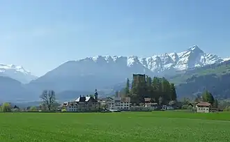 ![]() Schloss Paspels. Im Hintergrund der Piz Beverin, rechts die Ruine Alt-Süns. | ||