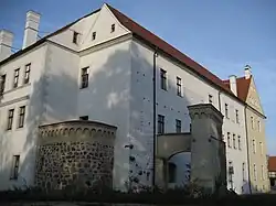Eine Mauer umgibt den Schlosskomplex, zu dem noch Gebäude der früheren Gutswirtschaft gehören, die um den südlich gelegenen Wirtschaftshof gruppiert sind. Der Zugang zum Schlossgelände erfolgt im Osten von der Stadt durch ein Tor, die Volutengiebel der Toreinfahrt stammen aus dem Jahr 1614. Das 1486 errichtete Torhaus ist ein verputzter Backsteinbau mit zwei Geschossen. Die Giebel sind durch Rundbogenblenden gegliedert. An das Torhaus schließt sich das eingeschossige, im 18. Jahrhundert gebaute Verwalterhaus an.