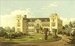 Das Haupthaus, ein zweigeschossiges, verputztes Gebäude mit 13 Fensterachsen, liegt in einem weitläufigen Schlosspark umgeben von drei Nebengebäuden: