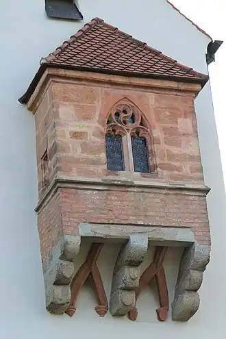 Bei dem Gebäude handelt es sich um einen viergeschossigen Satteldachbau aus dem Anfang des 15. Jahrhunderts. Profilierte Fenstergewände im ersten und zweiten Obergeschoss markieren die ehemaligen herrschaftlichen Wohnräume. An der Ostseite befindet sich ein auf drei Konsolen ruhender gotischer Flacherker mit Kreuzrippengewölbe und Maßwerkfenster. Er ist aus Sandsteinquadern erbaut und sitzt auf drei Granitkonsolen, die durch spitzbündige Wappenschilde verziert sind. Auf der Nordseite befand sich einst ein kleinerer Erker.[1] Der spitzbogige Eingang zum Turm liegt nur noch leicht erhöht im Erdgeschoss. Dieses besitzt wie das Untergeschoss ein Tonnengewölbe.