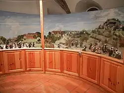 Die 15 Meter lange und teilweise bis 1,42 Meter hohe Hinterwand der Landeskrippe zeigt eine stellvertretende Auswahl oberösterreichischer Kulturstätten.[7]