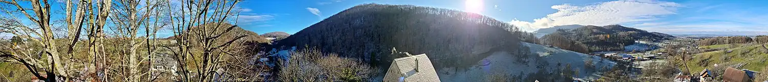 37 Treppenstufen führen zur Aussichtsplattform des Turmes. Von dort hat man einen Blick über die Dörfer Pleujouse und Fregiécourt.