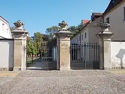 Von den ehemals im Park befindlichen Skulpturen ist nur noch ein aus Sandstein gefertigter, Flöte spielender Putto im Narrenkostüm erhalten geblieben. An der ehemaligen Anlegestelle an der Elbe sowie am Eingang von der Stadt zum Schlosshof befinden sich Sandsteinportale zum Park. 1798 erfolgte eine Umgestaltung zum Landschaftspark.[4]