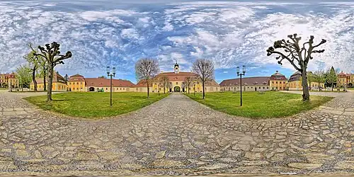 Die Schlossanlage erreicht man durch das zweigeschossige Torhaus mit barockem Turmaufbau. Das Torhaus ist Teil des Wirtschafts- oder Meierhofes, dessen einstöckige Gebäude (ehemals Ställe und Lager) sich an das Torhaus anschließen. Der Wirtschaftshof wird von zwei Kavaliershäusern abgeschlossen, die zum Ehrenhof, dem Vorplatz des Hauptgebäudes, überleiten.