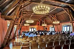 Ein Portal auf der Westseite der Burg führt in den geschlossenen Innenhof. Der Innenhof wird im Sommer als Gartenrestaurant genutzt.