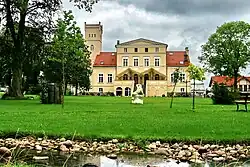 Das heutige Schloss wurde 1871 im eklektischen Stil von Hagen von Sobowidz mitten im Dorf erbaut. Es zählte damals zu den repräsentativsten Bauten im Kreis. Die von Mahnke ließen den Gutshof durch eine Brennerei und eine Schmiede erweitern.