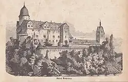 Schloss Rochsburg von Norden, um 1860, Holzschnitt (11 × 18 cm)