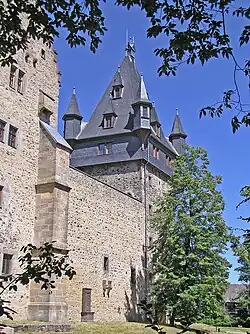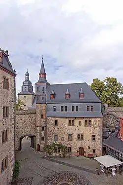 Zu den älteren Gebäuden der Kernburg zählt der sogenannte Kanzleibau mit der markanten hohen Turmhaube, ein spätgotischer Wohnturm, dessen Obergeschoss aus Fachwerk besteht. Der viergeschossige Herrenbau auf der Westseite mit Treppenturm sowie der Küchenbau im Norden wurden in der Umbauphase 1586–88 von Eberhardt Baldewein errichtet oder wesentlich umgebaut. Im näheren Umfeld des Schlosses sind noch mehrere Nebengebäude jüngeren Ursprungs erhalten wie Marstall, Pfortenhaus, Jägerhaus, Backhaus, Brauhaus und ein Schlachthaus.