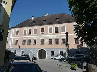Der dreieckige Innenhof ist hakenförmig von zwei Gebäudeflügeln begrenzt. Beide Flügel sind gleich lang. Jener an der Nordseite zeigt dreigeschoßige, aber verschiedenartige Arkaden, die mit einem Bogen auf den Haupttrakt übergreifen. Der Haupttrakt zeigt hofseitig eine aufgemalte Sonnenuhr, die mit 1600 datiert ist.[1]