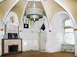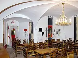 Im Erdgeschoss des Turmes liegt die ehemalige Kapelle. ein schlichter, fast quadratischer Raum, der mit einem achtstrahligen Gratstern überwölbt ist. Im zweiten Obergeschoss befindet sich der Bischofssaal, dessen strahlenförmiges Gewölbe ist mit fünfzehn leichtprofilierten Rippen ausgeführt.[1]