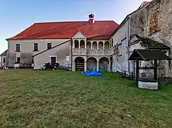 Der Baukörper war mit Sgraffitodekorationen verziert. Bemerkenswert sind die aus der Renaissance stammenden doppelgeschossigen Arkaden auf toskanischen Säulen, auf denen Wappen der Hochberg, Tschirnhaus, Kottwitz, Hermsdorf, Seydlitz, Konau, Reichenbach, Seherr, Ledlau, Tschammer und Nostitz angebracht sind.