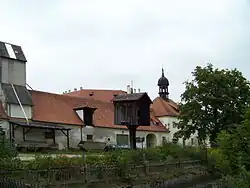 Die Schlossökonomie ist eine eingeschossige Dreiflügelanlage mit Walmdächern und zweigeschossigen Pavillons als Kopfbauten, Dachreitern und Hoftoren aus der Mitte des 18. Jahrhunderts. Die ehemalige Vogtei ist ein dreigeschossiger Walmdachbau mit Putzgliederungen, Rundbogenstil um 1860. Die Schlossgärtnerei ist ein eingeschossiger neubarocker Satteldachbau mit Pultdächern, Treppenturm mit Zwiebelhaube und Schweifgiebel um 1900.