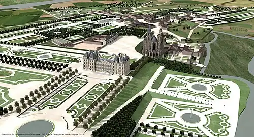 Vier Hauptgebäude begrenzten einen quadratischen Hof, dessen äußere Ecken aus vier großen Pavillons bestanden. Auf der Gartenseite schmückten neun Arkaden, die das Licht auf eine Galerie fallen ließen, jedes der drei Stockwerke der Hauptgebäude. Diese Galerien verbanden jeden der Eckpavillons und boten den Räumen, deren Fenster sich zu den Galerien hin öffneten, ein zweites Tageslicht. Eine mit Säulen geschmückte und auf Pfeilern ruhende Terrasse umgab das Gebäude auf der Hofseite.