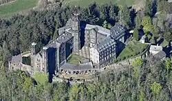 Das Schloss ist eine Dreiflügelanlage auf einem Berggipfel. Sein heutiges Aussehen hat es beim Ausbau von 1850 bis 1855 erhalten und ist nach dem Ideal der Rheinromantik konzipiert. Das Schloss wird von einem länglichen dreigeschossigen Palas mit oktogonalen Ecktürmen aus Basalt beherrscht. In der Südostecke des Palas befindet sich ein 42 Meter hoher Turm, der einen Bergfried darstellen soll. Als Zugang zum Schloss wurde eine Toranlage im Norden angelegt.