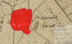 Schloss Schenkenau dürfte zwischen 1109 und 1135 von den Schenk von der Au als Wasserburg erbaut worden sein.[1] Mit dem Verkauf durch Eberhart Schenk von der Au an Herzog Wilhelm III. von Bayern-München 1417 begann ein steter Wechsel der Besitzer von Schenkenau. Herzog Wilhelm III. verkaufte Schenkenau 1422 an Wernher von Seyboltsdorf und dieser begründete die Linie Seyboltsdorf-Schenkenau, die bis 1608 im Besitz von Schloss und Hofmark blieb. 1608 wurde das Rittergut durch die Gebrüder Stephan, Johann-Georg und Johann-Albrecht von Seyboltsdorf zu Schenkenau an Moritz von Rorbach veräußert. Das Schloss wurde 1632 im Zuge des Dreißigjährigen Krieges von den Schweden zerstört. Der Sohn von Moritz, Heinrich von Rorbach, verkaufte Schenkenau wiederum 1639 an den Marschall und Pfleger zu Reichertshofen Johann Caspar von Eglof von Zell. Bis zirka 1700 wurde das Schloss wiedererrichtet, da es in einem Stich von Michael Wening aus dem Jahr 1701 abgebildet ist. Bereits 1711 ging Schenkenau in den Besitz des Grafen Johann Franz-Xaver von Freyen-Seiboldsdorf, den Pfleger des Landgerichts Moosburg, wurde aber bereits 1739 von seinen Söhnen an den Landmarschall Freiherr Joseph Clemens Freiherrn von Weichs verkauft und ging 1740 an seinen Vetter, den Grafen Karl von Preysing über. 1811 änderte sich der Besitzstand wieder, als Schenkenau von Graf Siegmund von Preysing, Statthalter zu Ingolstadt, an den Freiherrn Maximilian Emanuel von Perfall verkauft wurde. Da dieser Gutsbesitzer von Greiffenberg am Ammersee war und nicht vor Ort wohnte, hatte er keine Verwendung mehr für das Schloss und befahl 1812 die Schleifung desselben, die bis 1815 andauerte. Die Hofmark wurde im Zuge der Verwaltungsreformen in Bayern 1818 in ein Patrimonialgericht innerhalb der Gemeinde Waidhofen umgewandelt. 1839 wurden die Besitzungen in Schenkenau an Graf Maximilian August von Törring-Gutenzell verkauft.[2] Die letzten Adelsvorrechte fielen mit der Revolution 1848.