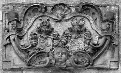 Blasonierung: „Das Wappen zeigt im gespaltenen Schild rechts in Silber eine rote Rose, links in Rot pfahlweise zwei silberne Rosen. Auf dem Helm mit rot-silbernen Decken ein silbernes und ein rotes Büffelhorn.“ |