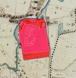 - Vorschloss, ehemaliger Wirtschaftshof mit zwei hakenförmigen Stalltrakten, der westliche bezeichnet mit dem Jahr 1752