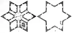 Er besteht aus ineinander gesteckten gleichseitigen Rauten, die einen sechsstrahligen Stern bilden, der dem Schloss seinen Namen gab. In fünf Sternspitzen liegen rautenförmige Säle, in der sechsten das Treppenhaus. Die mit Stuckdecken[1] dekorierten Räume werden durch ebenso verzierte Gänge getrennt, die in einem zwölfeckigen Mittelraum zusammentreffen.