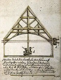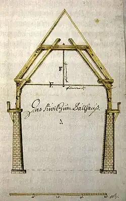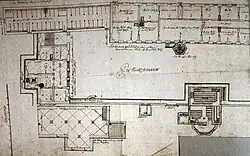 Das einstmals östlich des Marstalls vorgelagerte Ballhaus ist durch einen Schnitt und einen Grundriss aus dem Jahre 1720 gut überliefert. Abgedeckt durch ein Walmdach, handelte es sich um einen sich in die Länge erstreckenden rechteckigen Baukörper ohne jede innere Unterteilung. „Über die Seitenwände mit Kniestock erhob sich das aus sechs Bundachsen bestehende weit gespannte Dach, ein Hängewerk, das wegen der großen Spannweite von etwa 40 Fuß durch- und Hängeanker aus Eisenwerk zusammengehalten war“.[27] Auf der Höhe des Kniestocks befand sich ein umlaufender Gang für Zuschauer.