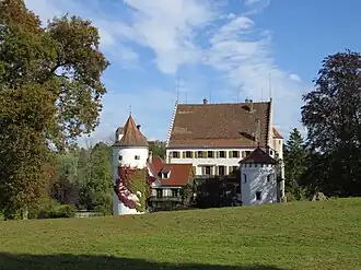 - ↑ a b Franz Prinz zu Sayn-Wittgenstein: Schlösser in Bayern. Residenzen und Landsitze in Altbayern und Schwaben. Verlag C. H. Beck, München 1972, ISBN 3-406-03492-6, S. 280 mit Abb. 274–275 (mit Fotos von Außenansicht und Treppenhaus).