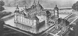 Das eigentliche Schloss, das zwecks Unterscheidung zum Torbau gelegentlich auch als Grand Château bezeichnet wird, ist ein dreiflügeliger Bau mit Schieferdach, dessen Trakte einen etwa 42 × 32 Meter[28] messenden Ehrenhof umrahmen. Dieser war an der Südostseite früher durch eine Mauer mit Blendarkatur und Wehrgang abgeschlossen, sie wurde aber im 18. Jahrhundert wegen Baufälligkeit abgerissen und durch die heutige Balustrade ersetzt.[40][41] Der Hof besitzt gemeinsam mit den drei Flügeln des Schlosses einen Grundriss in Form eines leicht trapezförmigen Vierecks, an dessen Ecken jeweils ein Rundturm mit Kuppeldach und bekrönender Laterne steht. Die beiden gartenseitigen Ecktürme im Norden und Westen – Colignyturm (französisch Tour Coligny) und Turm der Liga (französisch Tour de la Ligue) genannt – sind dreigeschossig und besitzen eine doppelte Laterne, während der südliche Archivturm (französisch Tour des archives) und der östliche Kapellenturm (französisch Tour de la chapelle) bei einem Durchmesser von zehn Metern[28] nur zwei Geschosse besitzen. Letzterer erhielt den Namen nach der in seinem Inneren eingerichteten Kapelle, was von außen durch ein bekrönendes Kreuz auf der Laterne erkennbar ist.
