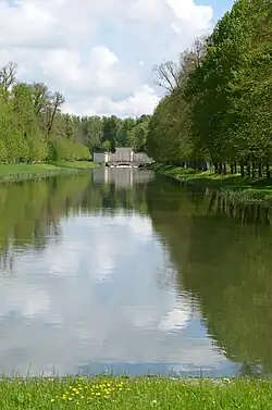 Ein Teil des etwa 58 Hektar[37] großen Schlossparks ist von einer rund 4400 Meter[24] langen Mauer eingefasst. Ein Großteil seiner Fläche wird heute als Golfplatz genutzt. Der Park wurde im französischen Stil angelegt und ist von einem Netz geradliniger Wege durchzogen. Auffälligstes Gestaltungsmerkmal ist der 526 Meter[53] lange und 25 Meter[57] breite Kanal, an dessen östlichem Ende als Point de vue ein kleines klassizistisches Wasserschloss mit dorischen Säulen steht. Gesäumt ist der Kanal von Bäumen, die mehr als 100 Jahre alt sind.[53]