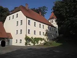 - Ehemaliger Wohnbau: dreigeschossiger Halbwalmbau mit Ecktürmchen, im Kern 17. Jahrhundert, in spätklassizistischen Formen überarbeitet