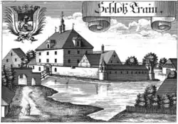 - ↑ Günther Koch: Johannes und Peter Obernburger im Dienst für Kaiser Karl V. Stoffsammlung für Biographien. Zweite, aktualisierte und erweiterte Auflage Dachau 2022. 5 Exemplare im Selbstverlag (ohne ISBN). Verwahrungsorte: München (Bayer. Staatsbibliothek), Würzburg (Universitätsbibliothek), Aschaffenburg (Stadt- und Stiftsarchiv), Obernburg (Stadtarchiv), Dachau (Verfasser). S. 65 mit Abbildungen von der Urkunde und dem Wasserschloss Train.