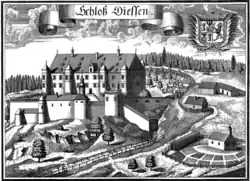 Das Schloss wurde von den Herren von Dießen errichtet. 1526 wurde es zerstört und wieder aufgebaut. Im 17. Jahrhundert wurde es von Johann Freiherr von Thurn und Taxis erworben.