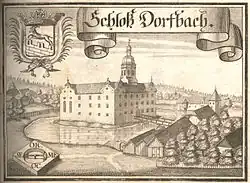 Eine Burg ist in Dorfbach bereits 1387 bezeugt.[1] Später sind auch zwei Burgen Ober- und Unterdorfbach hier nachzuweisen. Im Zuge der Einführung der Reformation in Ortenburg im Jahre 1563 wurde auch Dorfbach als ortenburgischer Besitz in den folgenden Jahrzehnten mit in den Konflikt hinein gezogen und von bayerischen Truppen besetzt. Graf Friedrich Casimir ließ das Schloss Unterdorfbach eifrig verschönern und zu seiner Residenz ausbauen, jedoch musste er das Schloss und die Herrschaften Ober- und Unterdorfbach nach 1652 aus finanzieller Not an die Familie Peckenzell verkaufen. Die Peckenzell hielten den Besitz bis 1805. Das kleine Schloss Oberdorfbach wurde in diesem Zeitraum bereits abgerissen, bis heute ist dessen Standpunkt nicht bekannt. Die Peckenzell kamen 1805 in die Gant und waren somit gezwungen ihre Besitzungen um Dorfbach an den bayerischen Staat zu veräußern. Von dem ehemaligen Wasserschloss Unterdorfbach sind nur noch Teile vorhanden. Der Großteil der Schlossanlage wurde abgerissen, während in den Resten 1836 die Schule und die Kirche St. Johannes Nepomuk untergebracht wurden. Letztere wurde in den ehemaligen Schlosssaal eingebettet. Die Schlossanlage wird als Bodendenkmal unter der Aktennummer D-2-7445-0088 im Bayernatlas als „Untertägige mittelalterliche und frühneuzeitliche Befunde und Funde im Bereich der mittelalterlichen Burg und des neuzeitlichen Wasserschlosses Unterdorfbach mit der spätneuzeitlichen Kath. Pfarrkirche St. Johannes Nepomuk, darunter die Spuren von Vorgängerbauten bzw. älteren Bauphasen“ geführt.