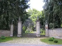 Das Schloss ist von weitläufigen ummauerten Parkanlagen mit einem aufwändigen schmiedeeisernen Portal umgeben. Im Park existieren noch zwei unterirdische Lagerräume, die wegen Einsturzgefahr gesperrt sind. Von einem von ihnen könnte man nach alten Unterlagen in einen verschütteten Keller im Schloss gelangen.