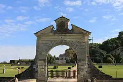 Der zum Schloss gehörige Park und Garten ist vollständig von einer Mauer umschlossen, an deren Nordwestseite zwei Rundtürme stehen. Eine mit Rosskastanien bepflanzte, rund 450 Meter[18] lange Allee führt von Südwesten auf das Schloss zu und öffnet sich in einem Halbkreis vor einem großen rustizierten Portal mit Gittertor und gesprengtem Dreiecksgiebel. Dahinter beginnt der Terrassengarten, der im 17. Jahrhundert entlang zweier Achsen angelegt wurde. Die erste verläuft in Verlängerung der Allee von Südwesten nach Nordosten, durchquert nach dem Eingangstor die von drei Wirtschaftsgebäuden aus dem Jahr 1650[19] flankierte Vorterrasse (französisch Terrasse des devants), überquert mittels einer dreibogigen Steinbrücke den fast 15 Meter[20] breiten Trockengraben, um schließlich nach der Terrasse der Florentiner Brunnen (französisch Terrasse des fontaines florentines) und dem einstigen Schlossstandort im Waldpark zu enden. Die zweite Achse beginnt im Südosten und endet im Nordwesten. Sie überwindet dabei insgesamt acht verschiedene Höhenniveaus und einen Höhenunterschied von 30 Metern.[21] Sie startet an einer Böschung mit Eiben und Hibiskussträuchern, verläuft weiter über die Obere Terrasse (französisch Haute terrasse) und die Terrasse der Florentiner Brunnen, durchquert die Terrasse der lothringischen Vase (französisch Terrasse du vase de Lorraine) und die Leda-Terrasse (französisch Terrasse de Leda), um über eine Treppe zur Terrasse der Anduz-Vasen (französisch Terrasse des vases dʼAnduz) zu gelangen und nach Durchquerung des Küchengartens schließlich jenseits einer Straße am Großen Kanal (französisch Grand Kanal), der durch die Brenne gespeist wird, zu enden.