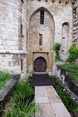 Die neuen Besitzer liessen nach 1309 das stark vernachlässigte Schloss mit im Erdgeschoss durchgebrochenen gotischen Tor ausbauen, das mit einer Zugbrücke erschlossen war. An den Gebäudeecken der östlichen Talseite wurden mächtige Strebepfeiler aufgemauert und Turmspitzen aufgesetzt. An die Rückseite errichtete man einen sechseckigen Treppenturm. An den Mauerkronen und über dem Tor wurden Reihen vorspringender Maschikuli genannten Abwurfvorbauten eingemauert. Diese von aussen geschützten Abwurfschächte, wurden in normalen Zeiten auch als Aborte benutzt. Eine weitere Verstärkung des Verteidigungsschutzes war der Bau eines runden Turms neben dem Eingang. Man hatte erkannt, dass runde Türme besseren Schutz gegen den Angriff mit Wurfmaschinen boten, denn an den runden Mauern prallten die Steinkugeln der Bliden ab ohne sie zu durchbrechen.