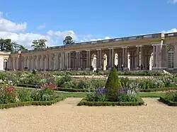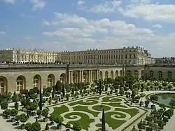 Den Übergang vom Schloss- zum Gartenbereich bilden die Parterres, die durch ihre niedrige Bepflanzung den Blick auf das Gebäude gewähren und durch ihre ornamentale Gestaltung die Motive der Baudekoration wiederholen.[43] Vor dem Nord- und dem Südflügel des Schlosses befinden sich prächtige Broderieparterres, das Parterre du Nord und das Parterre du Midi, die mit ornamentalen Blumenpflanzungen, zahlreichen Prunkvasen und Statuen dekoriert sind. Dem Corps de Logis sind zwei große Wasserbecken vorgelagert, die als Parterre d’Eau bezeichnet werden. In den fünfzehn Bosketten wiederholen sich die Säle des Schlossinneren im Freien.[43] Hier sind mit gärtnerischen Mitteln Salons zwischen Hecken und Bäumen eingerichtet, die man ebenfalls mit Skulpturen, Springbrunnen und kunstvoll beschnittenen Pflanzen ausstaffierte. Zu den bekanntesten Gartenarchitekturen Frankreichs gehört dort die von Mansart entworfene kreisrunde, mit dutzenden Springbrunnen verzierte Kolonnade, und die Salle de Bal (der Ballsaal), seinerzeit berühmt war auch das große Labyrinth von Versailles.