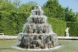 Das Broderie-Parterre im Parterre du Nord bildet eine leicht abfallende Schräge, in dessen Mittelachse am Ende eine Abfolge von Wasserspielen mit einigen der ältesten Wasserbecken und Skulpturen des Versailler Parks liegen: die sogenannte Pyramide und das Nymphenbad. Die Pyramide wurde von 1668 bis 1672 nach Entwürfen von Le Brun von Girardon geschaffen und besteht aus vier übereinanderliegenden Wasserbecken, die von Tritonen, Delphinen und Flusskrebsen getragen werden. Wie viele andere Brunnenfiguren Versailles’ waren auch diese ursprünglich vergoldet.[49] Von hier ausgehend führt die Allee der Marmousetten (auch: Allée d'eau = Wasserallee) nach unten; hierbei handelt es sich um eine Abfolge von je sieben kreisrunden kleinen Becken rechts und links des Weges, in deren Mitte spielende und tanzende Kinder eine Schale aus rosa Marmor halten, aus der Wasser herabrieselt.[50] Auf der untersten Ebene der nördlichen Anlagen öffnet sich ein großes Wasserparterre mit dem Bassin du Dragon (Drachenbecken) und dem großen halbkreisförmigen Bassin de Neptune (Neptunbecken). Das letztere wurde im 17. Jahrhundert von Le Nôtre begonnen, aber erst zur Zeit Ludwigs XV. im 18. Jahrhundert beendet. Es enthält zahlreiche Figuren von Wassergöttern, Tritonen, Seepferden, Delphinen, Seehunden und auf Drachen reitenden Amouretten, von denen insgesamt neunundneunzig Wasserstrahlen ausgehen, die „einen unvergesslichen Anblick bieten“.[51]