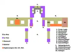 Das Corps de Logis mit dem integrierten alten Schloss enthielt die Wohnräume des Königs im Norden und jene der Königin im Süden, außerdem die Appartements der königlichen Kinder, der Mätressen, sowie die offiziellen Staatssäle. Die großen Seitenflügel und die Nebengebäude des Schlosses waren für die Aufnahme des Hofstaats vorgesehen. Der gartenseitige Trakt des Südflügels wurde auch als Prinzenflügel bezeichnet, da er die Wohnräume der Prinzen von Geblüt enthielt.[24] Der stadtseitige Trakt des Südflügels, sowie der gartenseitige Nordflügel dienten den Courtiers, also den übrigen Höflingen, als Wohnraum. Je nach Stand und Rang erhielten die Schlossbewohner zum Teil mehrere Zimmer große Appartements mit Wohn- und Arbeitszimmern, Ankleideräumen und Küchen zur Verfügung gestellt oder lediglich kleine, zum Teil nicht einmal beheizbare Kammern, die nur kurzen Aufenthalten dienen konnten.[25] 1789 beinhaltete das Schloss 288 Wohnungen, 1.252 heizbare Räume und 600 Räume ohne Kamin. Die königliche Familie bewohnte weitere 152 Zimmer.[26]