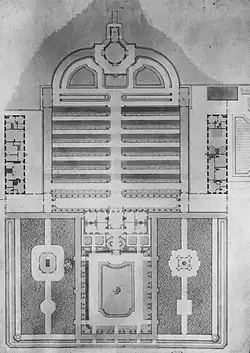 Knöffels Gartenplan weist eine halbovale Platzbildung auf, in deren Mitte sich die Substruktion erhebt. Die Seiten werden durch Viertelkreise gebildet, an deren Außenverlauf sich beidseits Rampen vom Platz zur Terrasse auf der Substruktion erheben, die auch den bergseitigen Abschluss des Parks bilden. Das Innere der Viertelkreise bilden Rasenflächen. Die mit Eckquaderung versehene sandsteinerne Stirnseite der Substruktion ist etwa so breit wie der Treppenweg vom Schloss herauf. An der Seite sind abgewinkelt verputzte Rundbogennischen eingebracht.