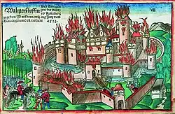 Die Burganlage wird auf dem Holzschnitt von Hans Wandereisen als massiver Bau gezeigt, der nicht nur durch einen Wassergraben gesichert ist, sondern auch durch eine innere und eine äußere steinerne Umfassungsmauer, die auf beiden Seiten mit Wachtürmen durchsetzt ist. Dem Bereich vor dem Torhaus ist eine weitere Mauer mit einem weiteren Torhaus vorgesetzt. Auch dieser vorgelagerte Bereich ist zum Teil mit Wasser gefüllt, so dass man zum Betreten der Burg zwei Brücken überqueren muss. Das äußere Torhaus ist durch eine zusätzliche Etage aus Fachwerk aufgestockt. Das innere Torhaus trägt über dem Torbogen das Wappen der Rosenberger. Der Eingang gegenüber dem inneren Torhaus führt in ein erstes hohes Gebäude, rechts davon findet sich das Haupthaus mit zwei Dachgiebeln, welches über einen gedeckten Verbindungsgang mit einem Turm verbunden ist. Der Turm ist nach oben verbreitert. Im Hintergrund ist noch ein weiteres kleines Gebäude erkennbar. Abgesehen von Haus und Turm sind Gebäude und die Wachtürme innerhalb des ersten Wassergrabens in den oberen Stockwerken aus Fachwerk gefertigt. Sofern die Wachtürme noch nicht durch Flammen verdeckt sind, laufen deren Dächer spitz zu und ihnen ist eine Kugel aufgesetzt. Alle Teile der Burg werden fast ausnahmslos brennend dargestellt, Dächer stehen in Flammen, Flammen züngeln ebenso aus den Fensteröffnungen. Die komplexe Burganlage füllt als Motiv den Holzschnitt aus, es befindet sich lediglich ein kleines Gebäude außerhalb der Mauern vorne rechts im Bild. Das Heer des Schwäbischen Bundes ist in zwei Teilen getrennt dargestellt. Die Reiterei mit einem auch regelmäßig in den anderen Holzschnitten wiederkehrenden Hauptmann befindet sich links im vorderen Bildbereich, die Fußtruppen und zwei berittene Ritter sind hinter der ersten Umfassungsmauer, die den Eingangsbereich zusätzlich abschirmt, versteckt angedeutet.