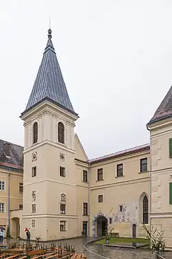 Neben dem Torbogen erhebt sich in der nordwestlichen Hofecke ein Turm, dessen Unterbau ebenfalls gotisch ist. Das Obergeschoß mit einem Spitzhelm stammt jedoch aus dem Barock. Die beiden Glocken stammen aus dem 14. und 15. Jahrhundert. Am Turm sind die Wappensteine des Bischofs Matthias Scheit (datiert 1483), des Industriellen Maximilian Seßler (datiert 1846)[2] und der Äbte Gregor Pöck und Franz Gaumannmüller angebracht.