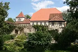 Das Hauptgebäude im Süden ist ein zweigeschossiger verputzter Bau, der teils massiv, teils in Fachwerkbauweise über einem hohen Sockel ausgeführt ist und von einem Halbwalmdach bedeckt wird. Das Gebäude wurde 1588 über einem älteren Kern errichtet, in der Schlossküche im Erdgeschoss sind möglicherweise noch Reste des Wohnturms des Vorgängerbauwerks aufgegangen. Es wurde im 19. Jahrhundert umgestaltet. Nordöstlich schließt sich ein zweigeschossiges verputztes Torgebäude mit rundbogiger Durchfahrt an, daran ein dreigeschossiger verputzter Eckturm mit Zeltdach. Auch die Obergeschosse dieser Gebäudeteile wurden im 19. Jahrhundert erneuert. Über dem Hauptportal im Osten ist das Wappen der Ortsherrschaft mit Datierung 1590 angebracht.[1]